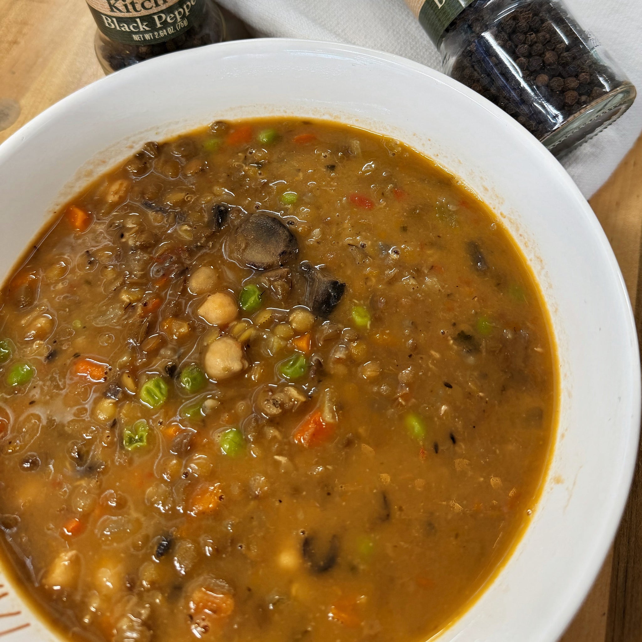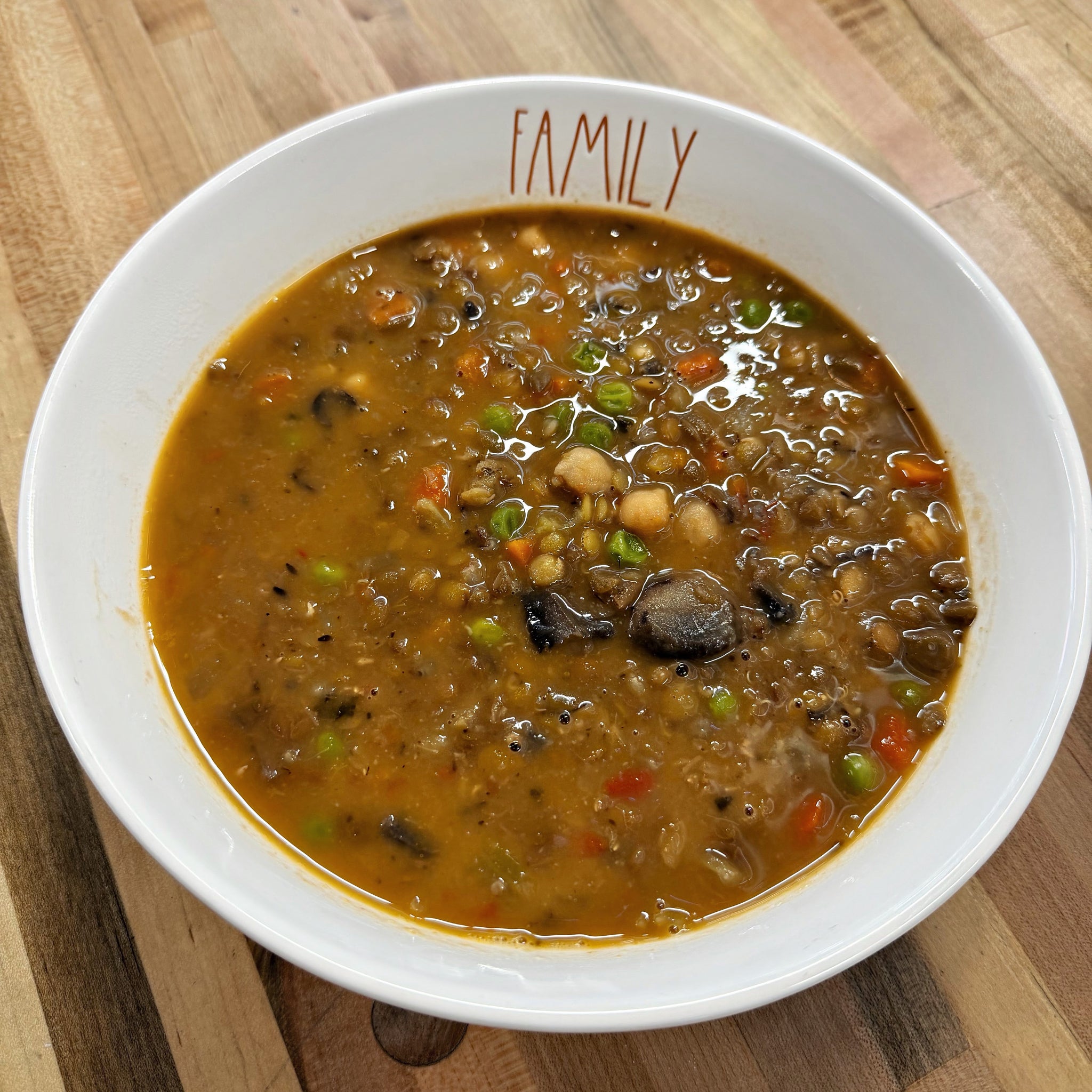 A hearty and nourishing Mediterranean-inspired soup made with protein-rich lentils and chickpeas, simmered in a savory chicken broth. Infused with garlic, onions, tomatoes, and a blend of wholesome vegetables like carrots, celery, and mushrooms, each spoonful is rich in flavor, comforting, and deeply satisfying